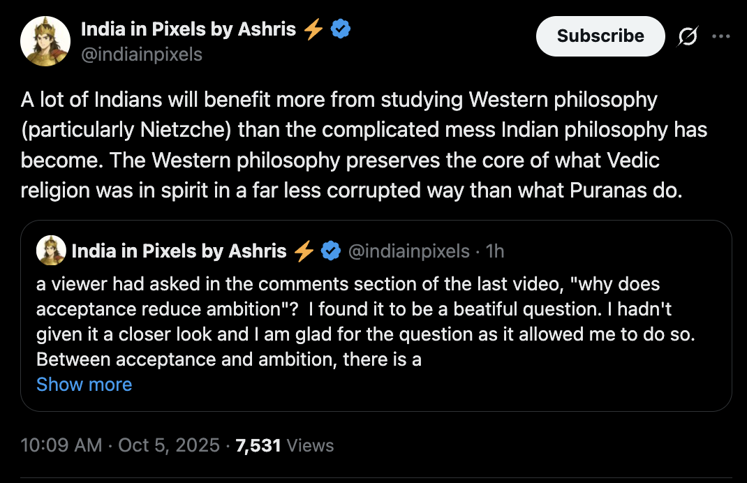 the reason the puranas have such strong memetic strength is obvious, when basic necessities aren’t in surplus, people work day and night just to feed their families. That leaves no time or energy to ponder, so the burden of existential inquiry gets outsourced to scriptures. even with freedom the habit of inquiry is outsourced as in modern india, this happens when the memetic strenght of existing culture is too strong to permit deviation.
